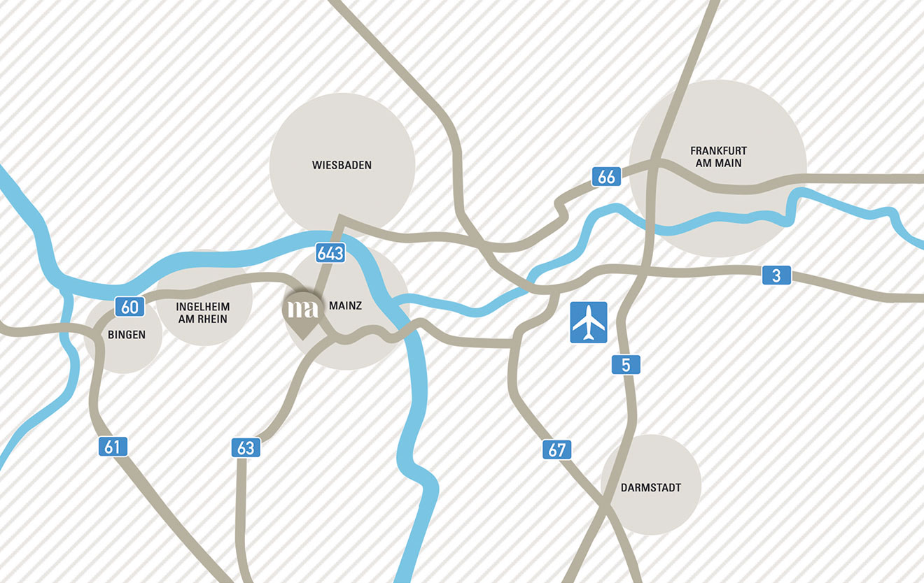Als Autofahrer profitieren Sie von der zentralen Lage im Rhein-Main-Gebiet und der optimalen Anbindung an die gesamte Metropolregion. Schnell und bequem erreichen Sie die Anschlüsse zu den Autobahnen A60, A63, A671 und A643. Über die A643 sind es nur wenige Fahrminuten in die hessische Landeshauptstadt Wiesbaden, die mit kulturellen Highlights, vielfältigen Kurangeboten, exklusiven Boutiquen und internationaler Spitzengastronomie lockt.